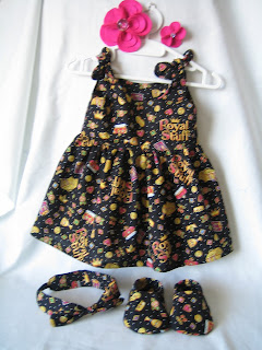 To the left of the shoes is a little hair band (which is my only creative contribution). I took 2 different length strips of fabric (same width, though) and sewed them into a tube, curving one end. I turned them right side out, and sewed a little piece of elastic between, tucking in the corners next to the elastic to make it look a little nicer. I tied a double-knot at the top, which matches the ties on the dress. The idea is that M’s mom can tie it the right size for little baby M when she arrives, and the elastic will help to keep it on baby M’s head, and make it easy to take on and off. Great since I have no clue how big her head will be! : )