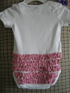 I saw some really cute ruffle-butt onesie tutorials out in blog-land, and really liked Char from {Crap I’ve Made}‘s Tutorial over at U-Create. But… my serger is out of commission (the shop says they’ll work on it for $300.00, but no guarantee that they’ll be able to get it working properly). She has a couple good options for making ruffles without using a serger, but I decided to go a slightly different route… here’s what I did.