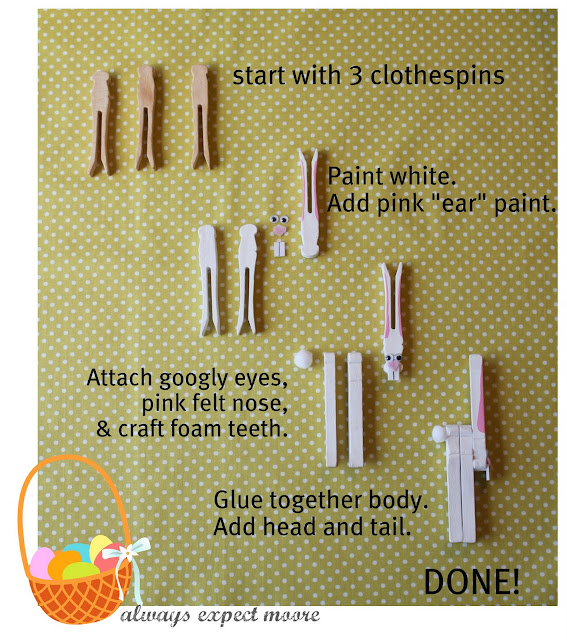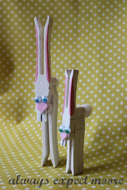 I played around making several different variations. I found some colored googly-eyes, which I think is perfect for these little Easter crafts. I made them with both big and small clothespins, and they worked equally well both ways.