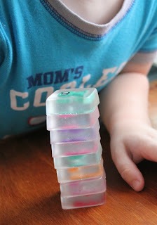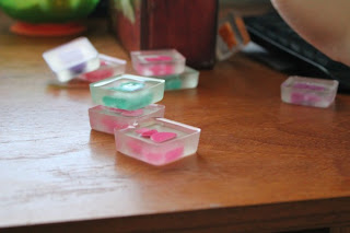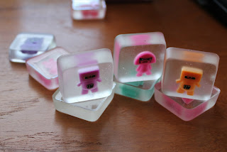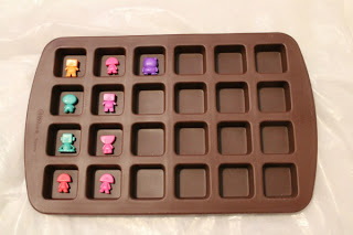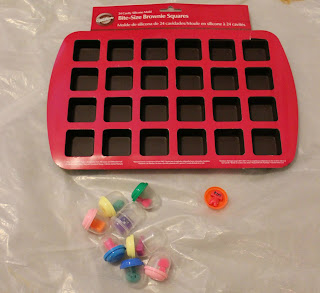 While at the grocery store, I found this silicone pan. It is supposed to be for making bite-sized brownies. The perfect size for what I was looking for! While at the store, I spent my quarters at the toy-vending machines to give my blocks a little personality.