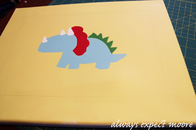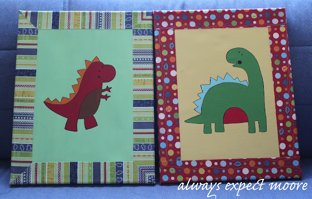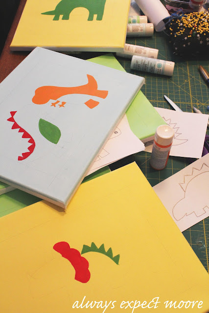 Today I’m showing you the painted dinosaur canvasses that I made to hang on the walls of the baby’s room. Now before you think I’m some fancy free-hand artist like my friend Colleen, I’ll tell you that I totally cheated. These are VERY easy to make!