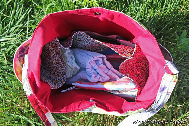 The inside is super-roomy. I used some fabric I had on-hand to create interior pockets. A zippered pocket, two side pockets (made the same way the side pockets are made on the outside of the bag), and a large pocket along one side of the bag. This makes for an awesome EIGHT pockets on this bag!