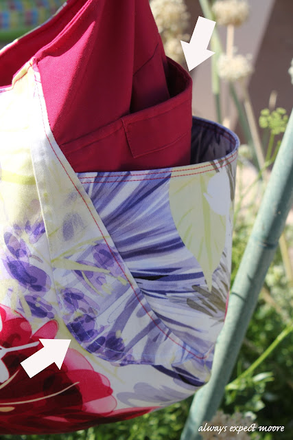 You can see at the top of the red fabric, the original pocket from the red blazer. This also gave me an extra pocket on each side of the bag, with no extra work. At the bottom, you can see the original seam from the back of the blazer, which mirrors the new seam on the tote.