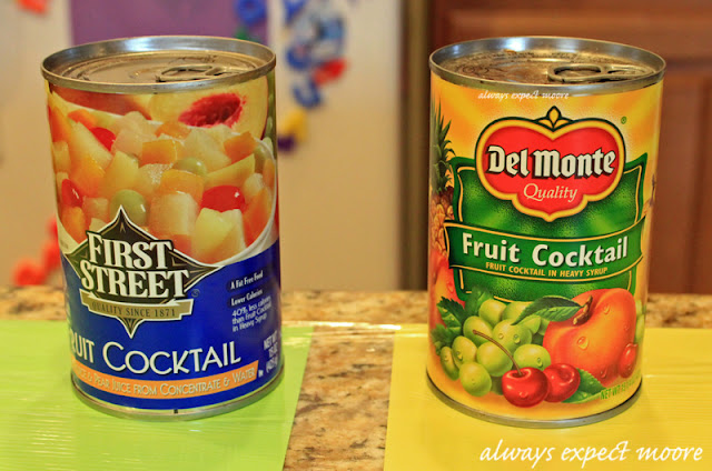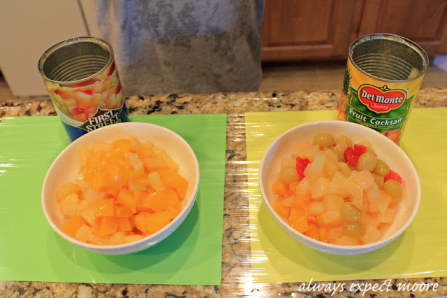 “Mommy, don’t play with your food – you’re supposed to eat it!” my son said as we sorted the fruit. It was easy to find the cherries and grapes. Sorting the peaches from the pears was a little harder. And picking the pineapple from the pears was even harder. The final result was that the cans have approximately the same amounts of the same kinds of fruits.