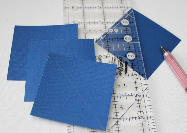 I drew a line from one corner to the other, across the backs of the 3″ blue squares.