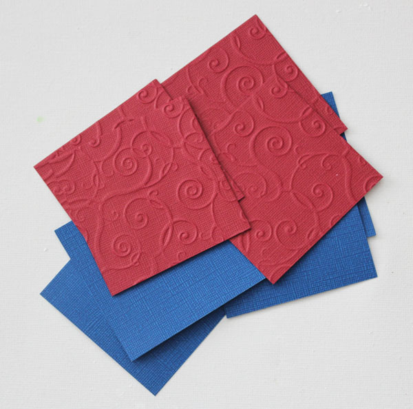 I started by cutting my pieces. From the blue, I cut 4 squares, each 3″x3″, and 4 squares each 2.5″x2.5″. From the red I cut 4 squares each 3”x3″ and 1 square 4.5″x4.5″