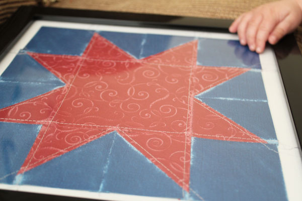 I attached the whole block to the mat that came with the frame using glue dots. I used glue dots on the back of the mat to secure the loose ends of the threads. I could have trimmed them, but I like the extra touch that says “I really was stitched on a sewing machine”