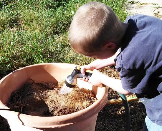 Our last watering nozzle for our hose has gone “mysteriously” missing, so I had to buy a new one. You can see the two I purchased in this picture. One is a combo water+feed nozzle. It feeds the plants while watering them, which is great. My son loves to do this part. I knew he would. Which is why I bought the second nozzle. Although the MiracleGro Nozzle has an option to use it without the plant food portion, my son would play with it as if it was his own personal toy. Switching the feeding nozzle out for a standard nozzle when we are not feeding the plants means that he can still play with the different sprayer settings, without me worrying that he is “feeding” our sidewalk.