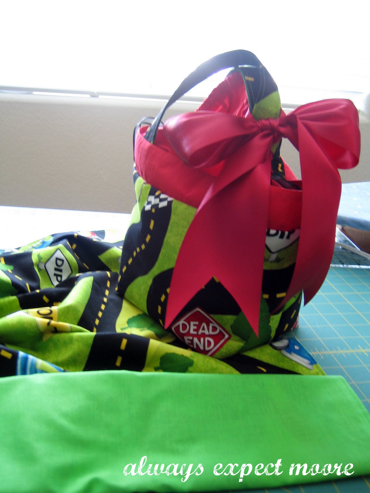 I was feeling a little guilty, though, so I also made a fabric bag using the Lunch Bag Tutorial from Pink Penguin. After adding in a package of Matchbox cars, a card and a bow, the present didn’t even need to be wrapped!