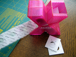 This is the Xyron 1.5″ Sticker Creator. I was able to toss the evil little glitter squares in, and when I pulled them out the other side, their backs were covered in adhesive! This adhesive is amazing stuff, because it kept the holes in the middle of the rings un-adhesived (which is not a word, but should be). Plus, it was super simple, and super fast! I bought this sucker a couple months ago for about $10, thinking it might come in handy… and now it has!**