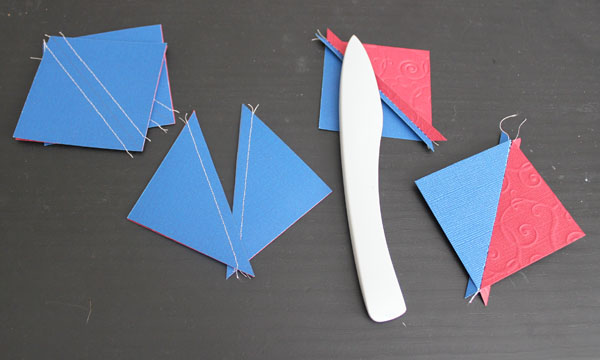 I drew a line from one corner to the other, across the backs of the 3″ blue squares.