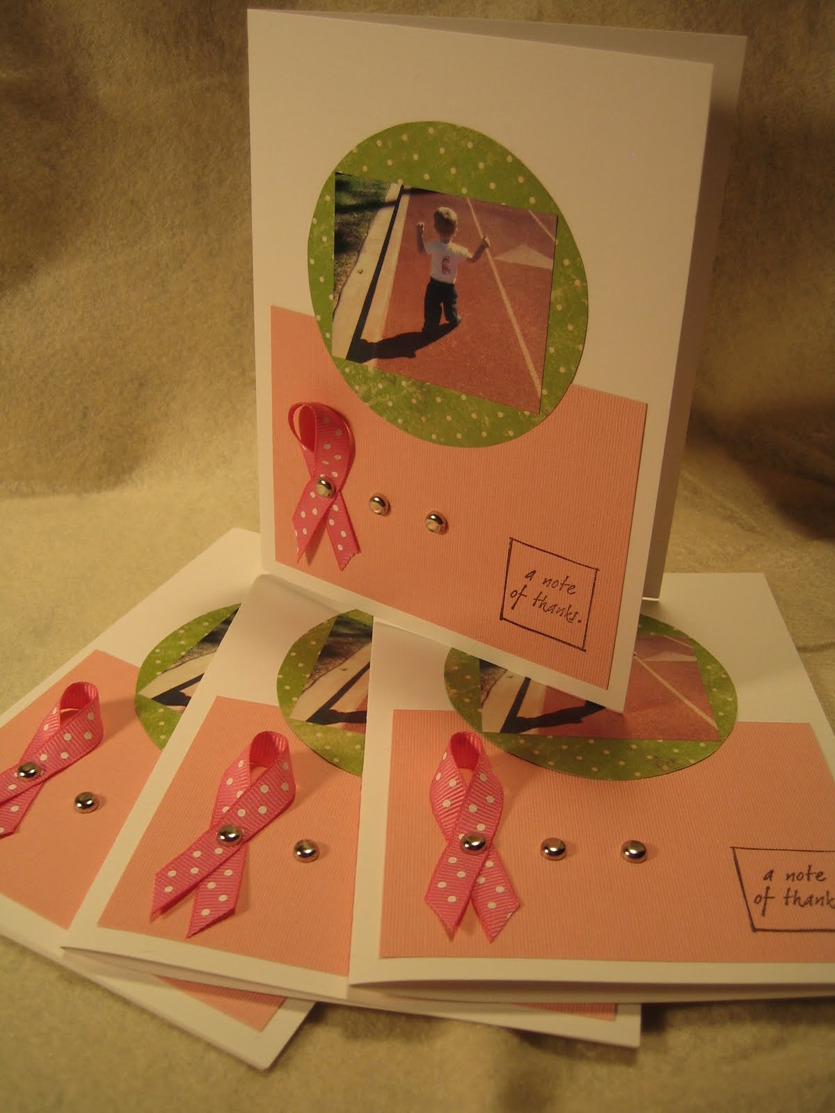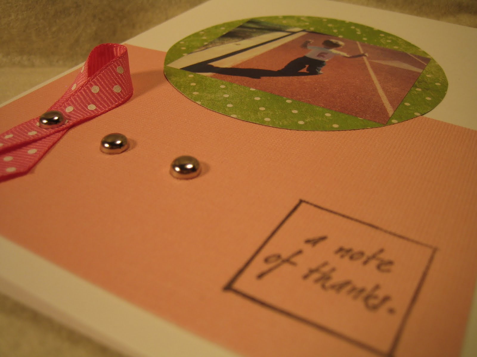 I chose pink because of the Breast-cancer tie-in, and loved the contrast of the green and pink (and the photo I was using had pink and green in it – BONUS!). The green paper I found in my stash also had little white polka-dots on it, which tied in with the ribbon (DOUBLE BONUS!!).