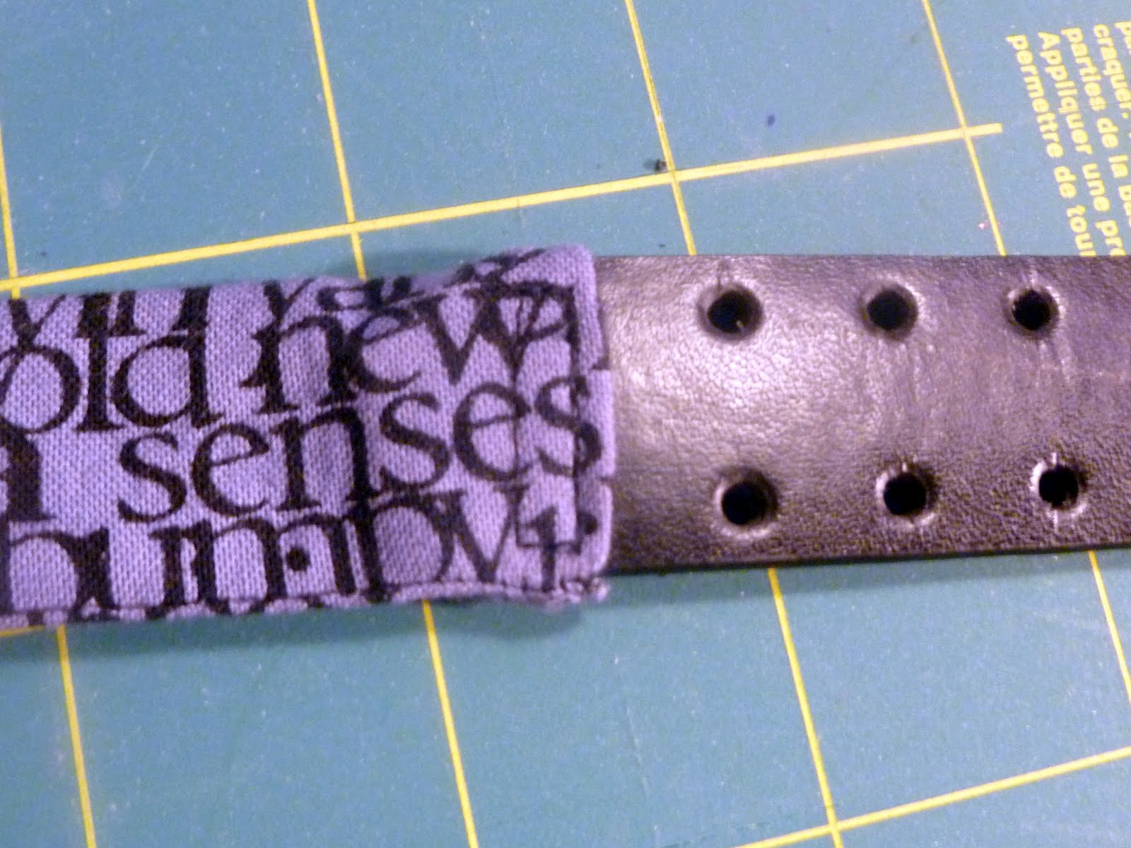 Start off with a belt that mysteriously “shrunk” while sitting in your closet. Pick out a fun fabric. I have a “thing” for fabric with words, so I used a wordy fabric from my stash.