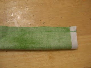 I cut a piece of coordinating fabric that was 9 X 6 3/4. Fold over width wise (9 inch across) 1/4 inch and press. Fold over again 1/4 inch and press. Top stitch.