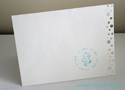 I used a large stamp on the left. The right is 2 shapes cut with my Cricut (yes, I had to pull out the “big guns”). The aqua was rubbed with distress ink, as were the edges of the card. To keep the colors going, I used the distress ink to stamp the large stamp on the left. I colored in the duck, and added a little raffia to the hole in the tag. Honestly, I wish it didn’t have a hole, but that’s the way it came off the Cricut, so I just went with it.