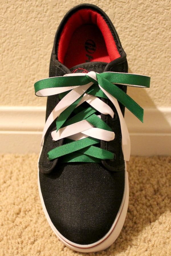 To get this effect, I wove the laces through, always going up through the holes. In the first row I have just green, the second I did both white and green, the third is just white, the fourth just green, and the top has both, before tying a bow. It is easier to just have one color in each row, but putting both colors in row two meant that I got two “stripes” of each color, instead of making one color more dominant. If I had chosen to go with red and white, this would make a fun candy-cane effect for the holidays.
