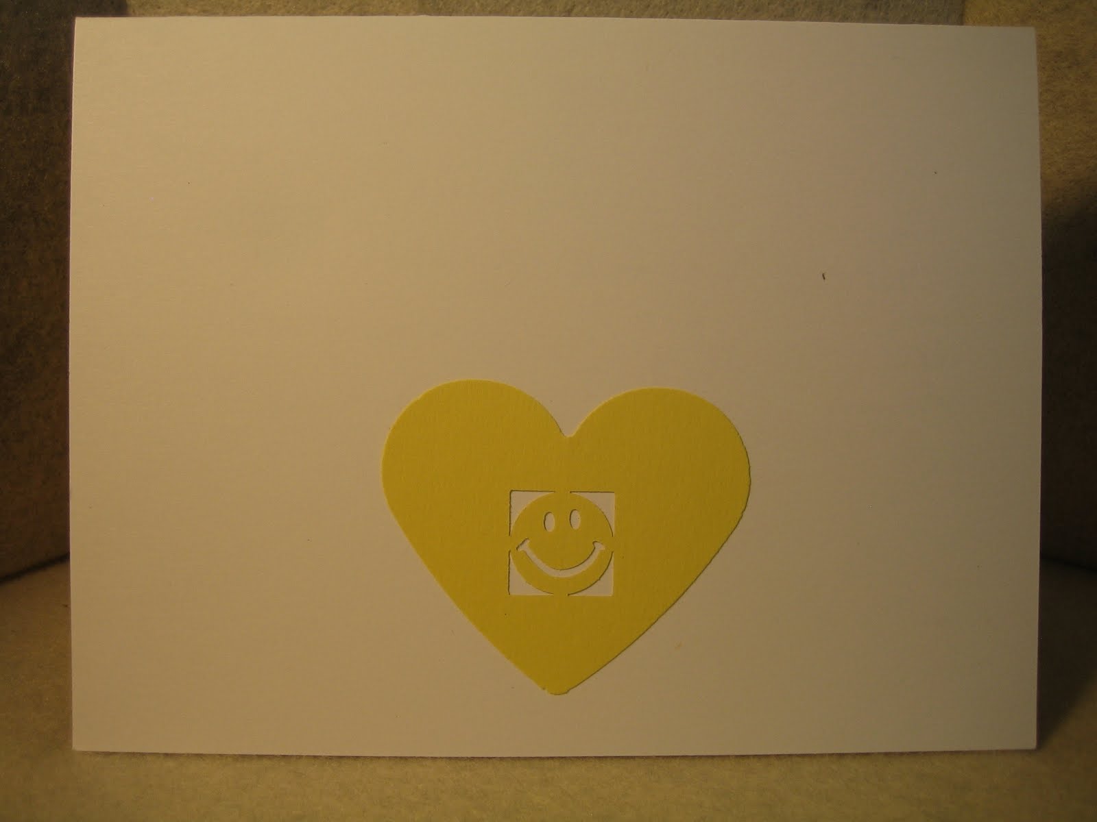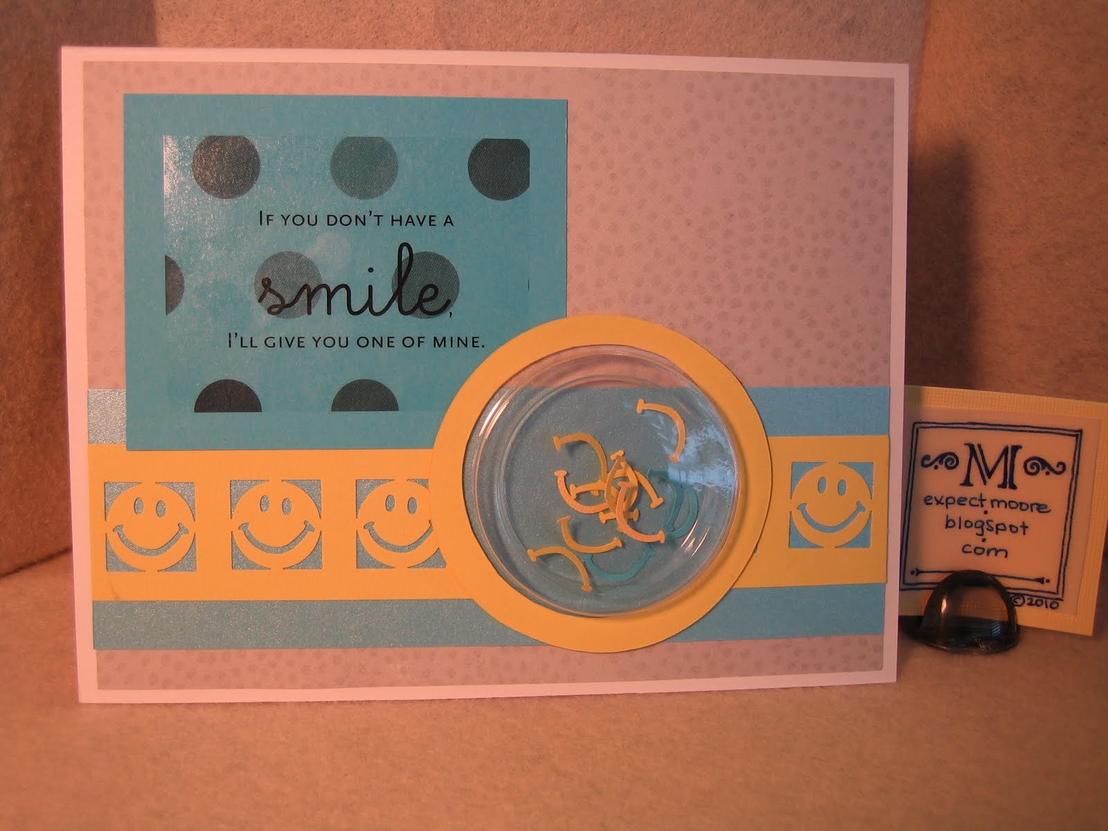 I started off with a plain ol’ white card, some grey paper with little grey dots (from Creative Memories), yellow cardstock, and some blue papers (the bottom one has a pretty pearly sheen that doesn’t come across well in the photo). The sticker is one I had in a stack from YEARS ago (at least 4 or 5), as well as the little memorabilia pocket. After I dug up the sticker, I KNEW it was what I wanted… and I knew that I had a smiley punch somewhere… After digging through 3 drawers, and finding an old business card holder and 2 different pairs of Fiskars paper Edging scissors… I found the smiley punch! Yup… I’m still not done organizing yet!