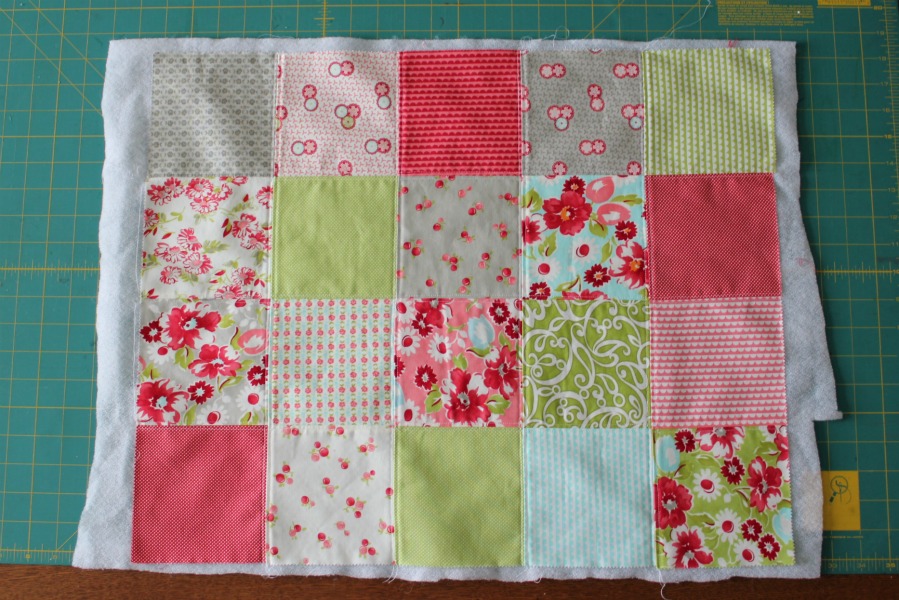 Then it was time to re-cover the seat. I could have used a regular piece of fabric, but as a quilter I wanted something a little more quilt-y. I grabbed 20 charm squares (5″ squares) from the brand new Ruby charm pack I just bought. I stitched them together patchwork-style.