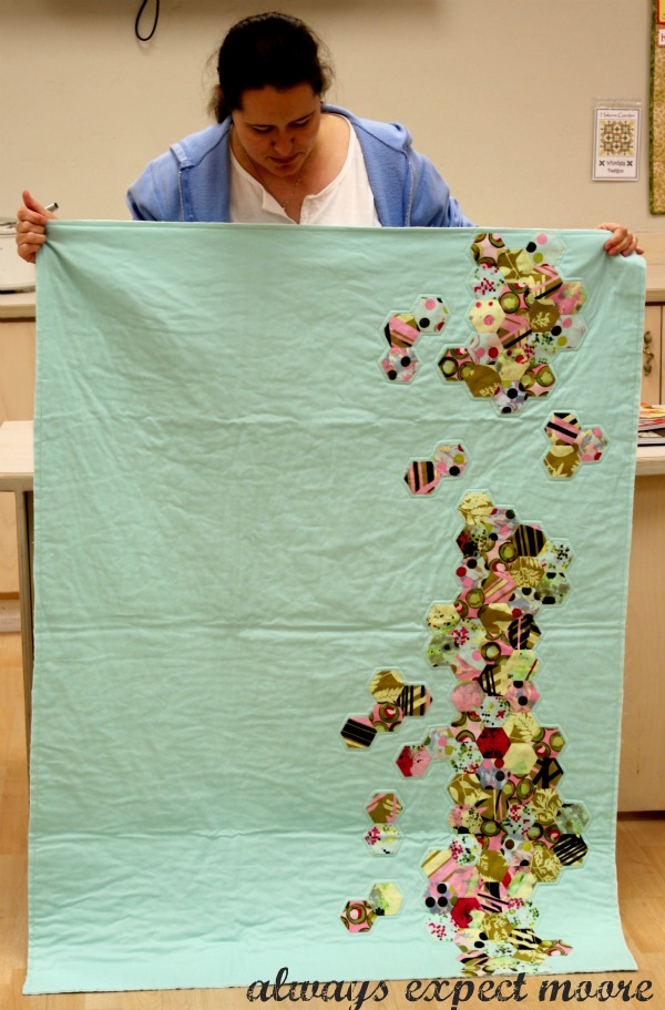 Only a few days after getting our fabrics, I was introduced to English Paper Piecing. It was a technique I’d never tried before… so I thought why not try it on this fabric? I thought it would be fun to use an old, hand-sewn technique on these very modern fabrics. And, since English Paper Piecing is done by hand, I thought I’d have a good chance of getting it all done… since several trips out of town were going to be keeping me away from the sewing machine.