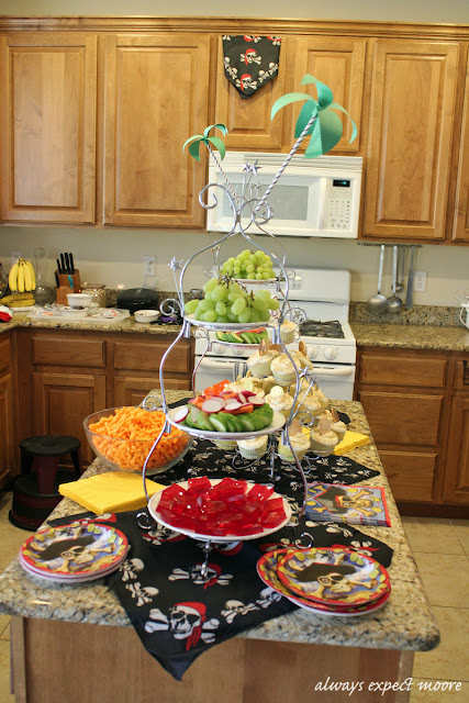 In the kitchen, I put down Pirate bandanas as the table runner. We had grapes and veggies, cheetos, and jello jigglers cut into squares (they were supposed to be Pirate jewels). To drink there was apple juice, bottled water, and lemonade (anti scurvy elixer).