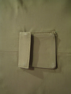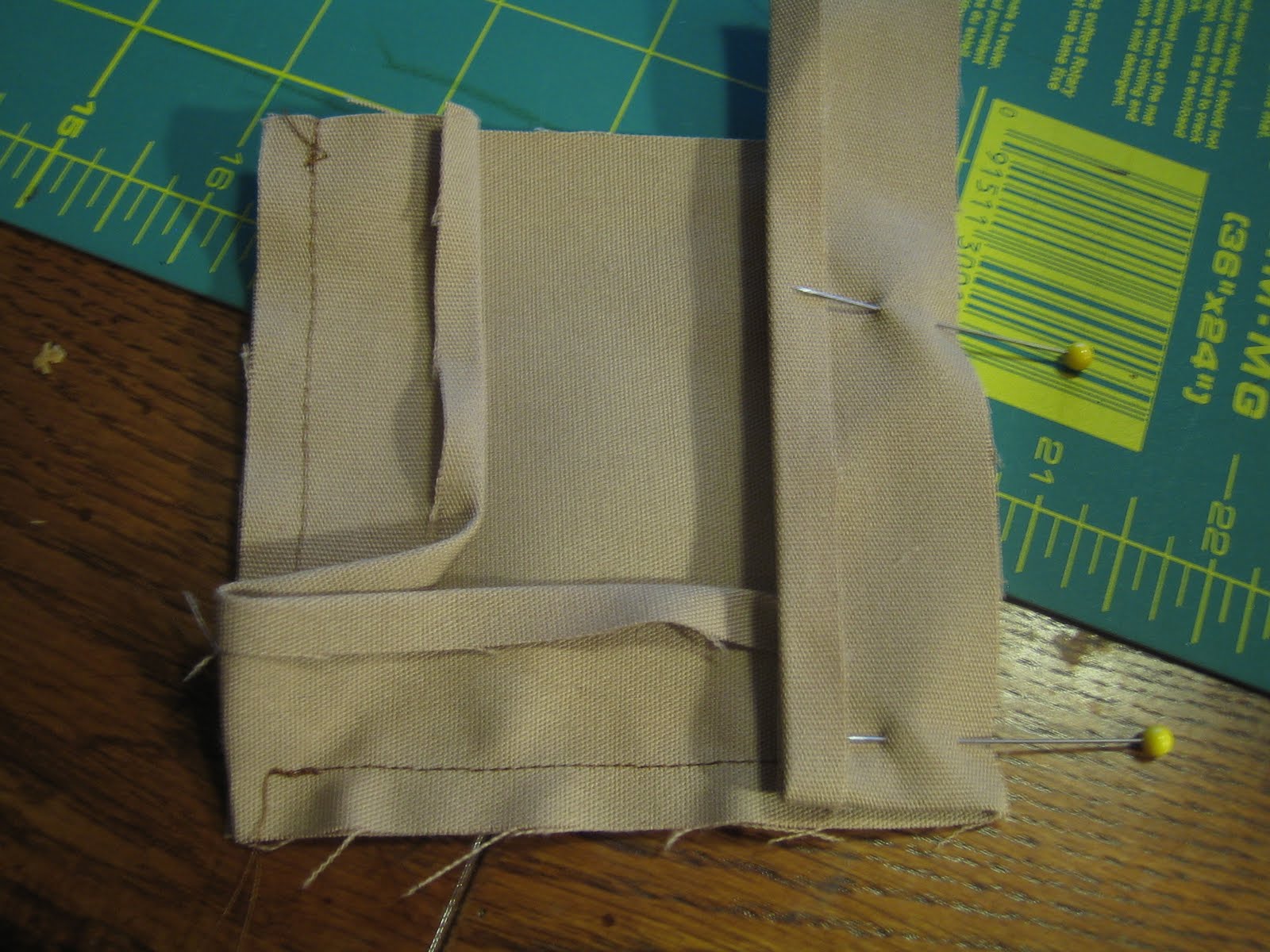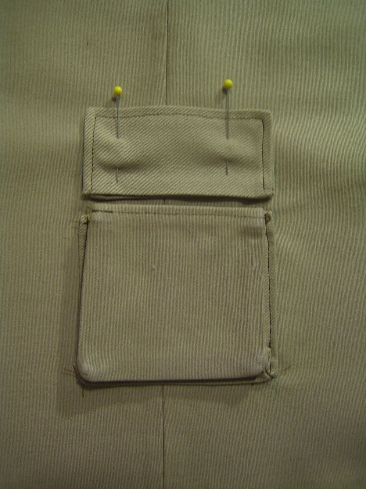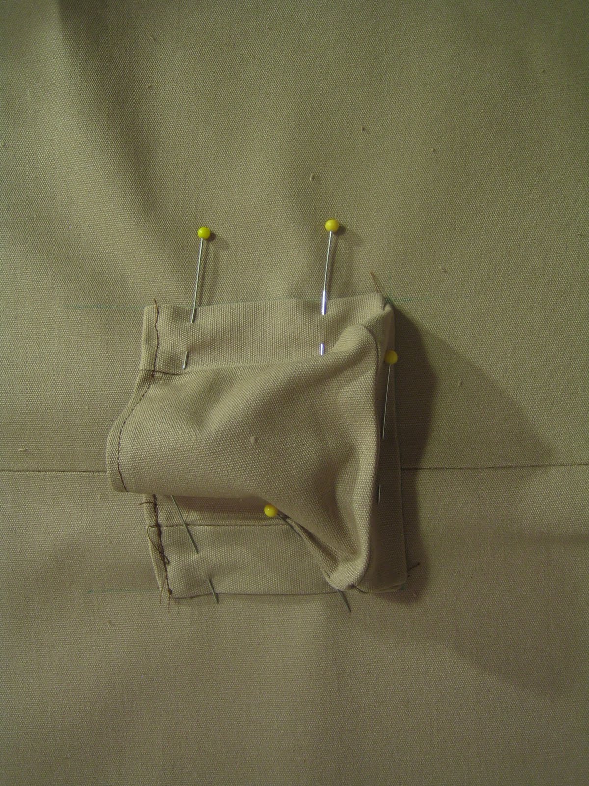 Using your fingers, press in the sides and bottom, flattening the top to the pants. Press with a hot iron and lots of steam. Turn the fabric over, and press again from the back with lots of steam. Take a top flap, and pin above the pocket.