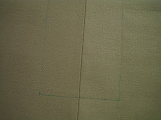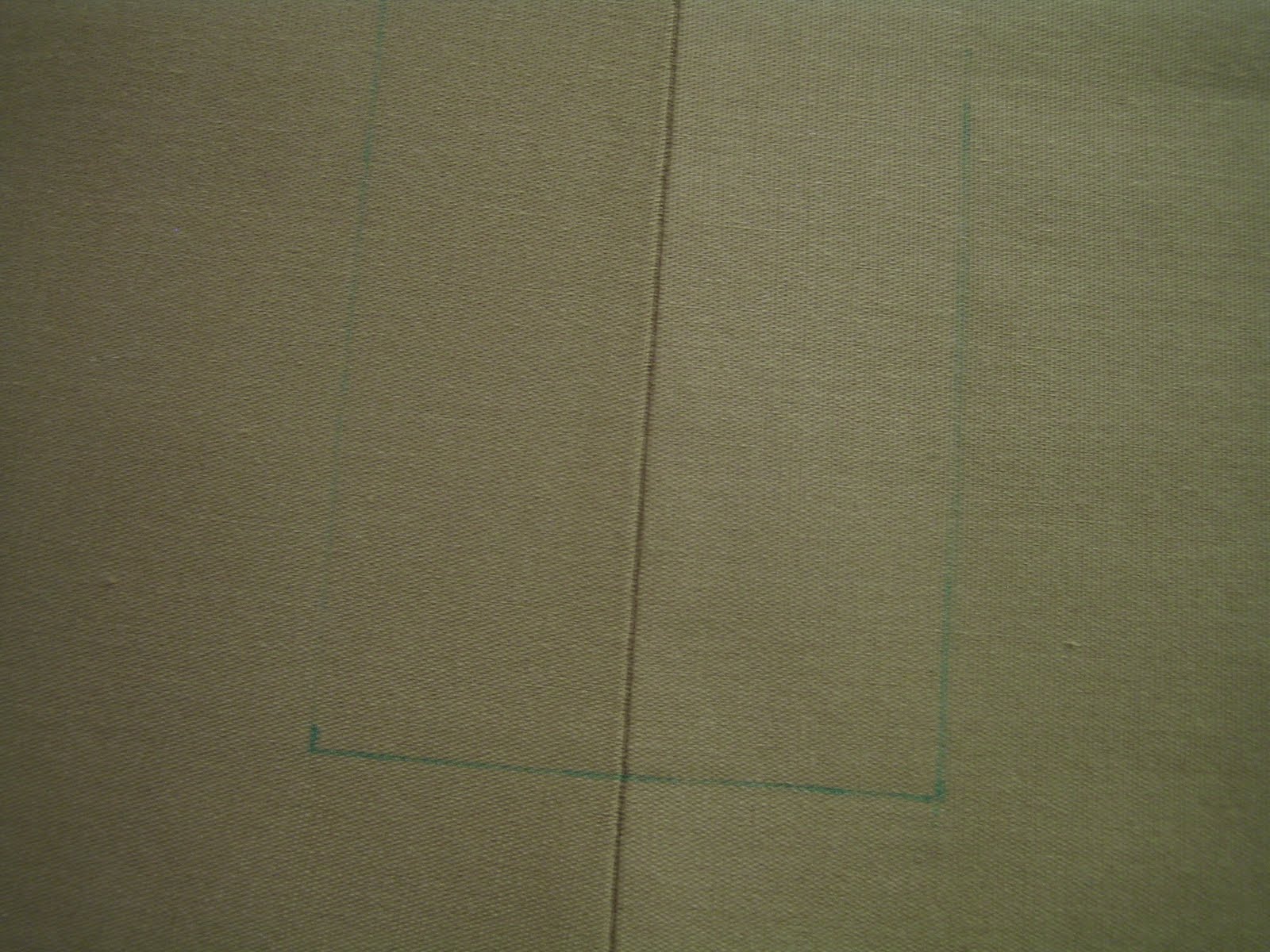 Press open your seam. Measure your pockets. Mine were about 1 3/4″ wide. I drew the bottom and 2 sides of a rectangle in this size on the side of the pants. I measured my bottom line 3″ from the bottom.