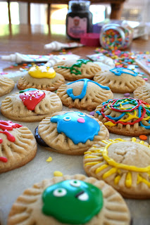 Friday I made some Chocolate Dream Cookies that I have posted about once on my blog. They’re basically two sugar cookies with a tablespoon of a chocolate filling in the middle. The chocolate filling is made by scalding heavy cream and adding semi-sweet chocolate chips. This was, however, my first attempt at decorating cookies. I hate to toot my own horn, but I love them.