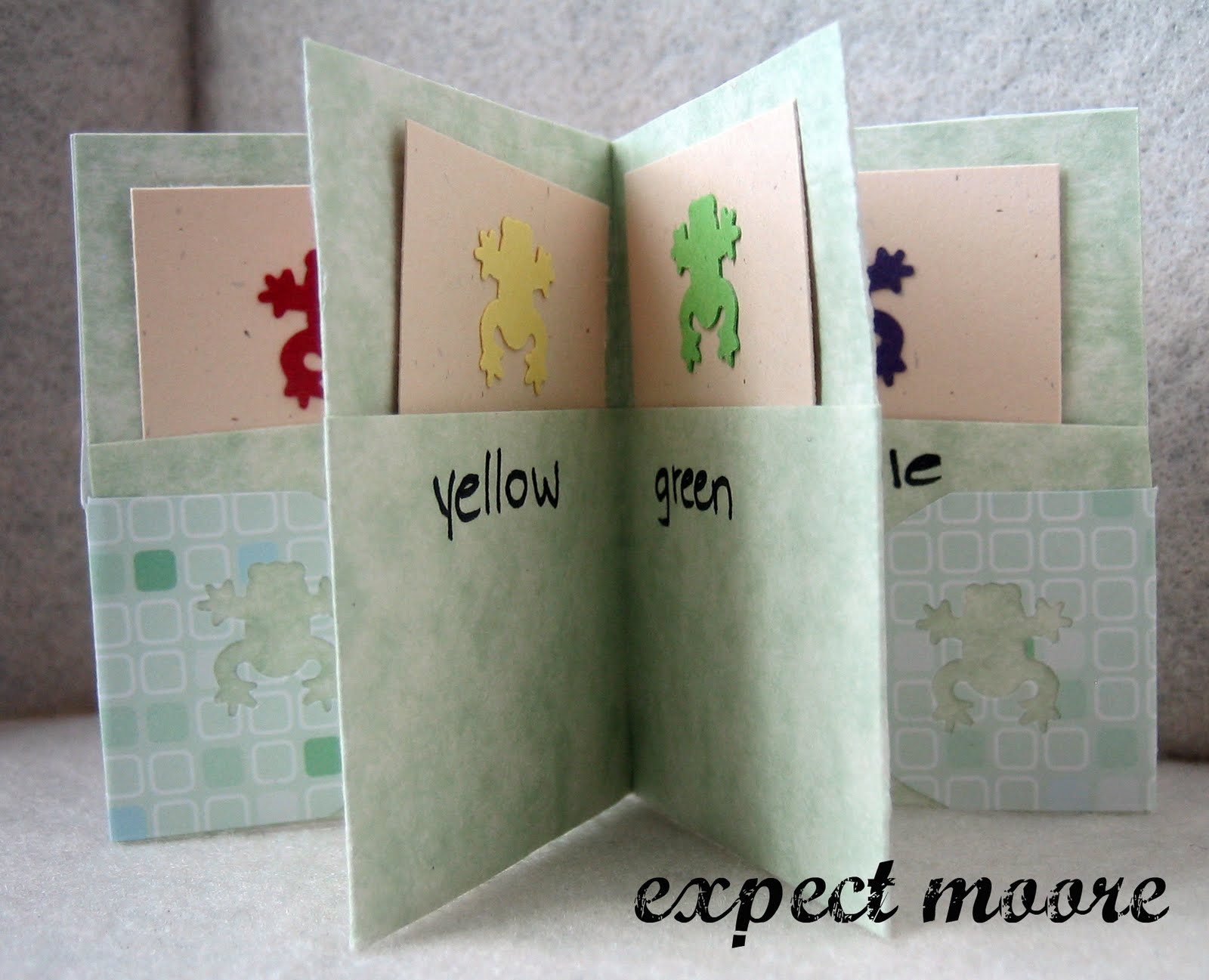 I cut 6 strips 1.5×2″, punched frogs out of different colored paper, and glued them on the top of each strip. I then labeled the pockets “red, orange, yellow, green, blue, purple.”