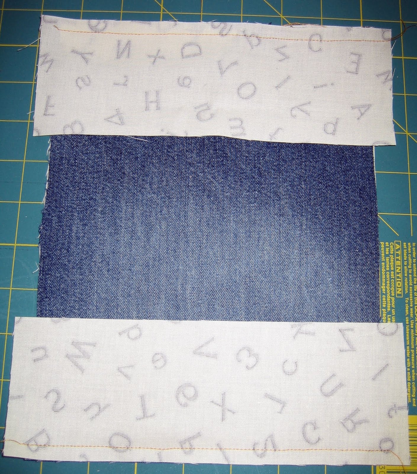 You’ll need a pair of old jeans and a yard or so of fabric, depending on the size and quantity of finished pillows (I used a fun cream colored with letters, but a red bandana print would be cute… but these are jeans, just about any fabric will go well with jeans!). You’ll also need some fabric for the inner pillow, as well as some batting (pillow stuffing).