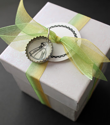 This gift box is probably my favorite submission. I used the same circle stamp as in the scrapbook layout, and pulled ribbon through a hole in the center. I made a charm using a dress stamp and a bottle cap, covered in dimensional magic. The box was painted with glitter paint to add some extra sparkle.