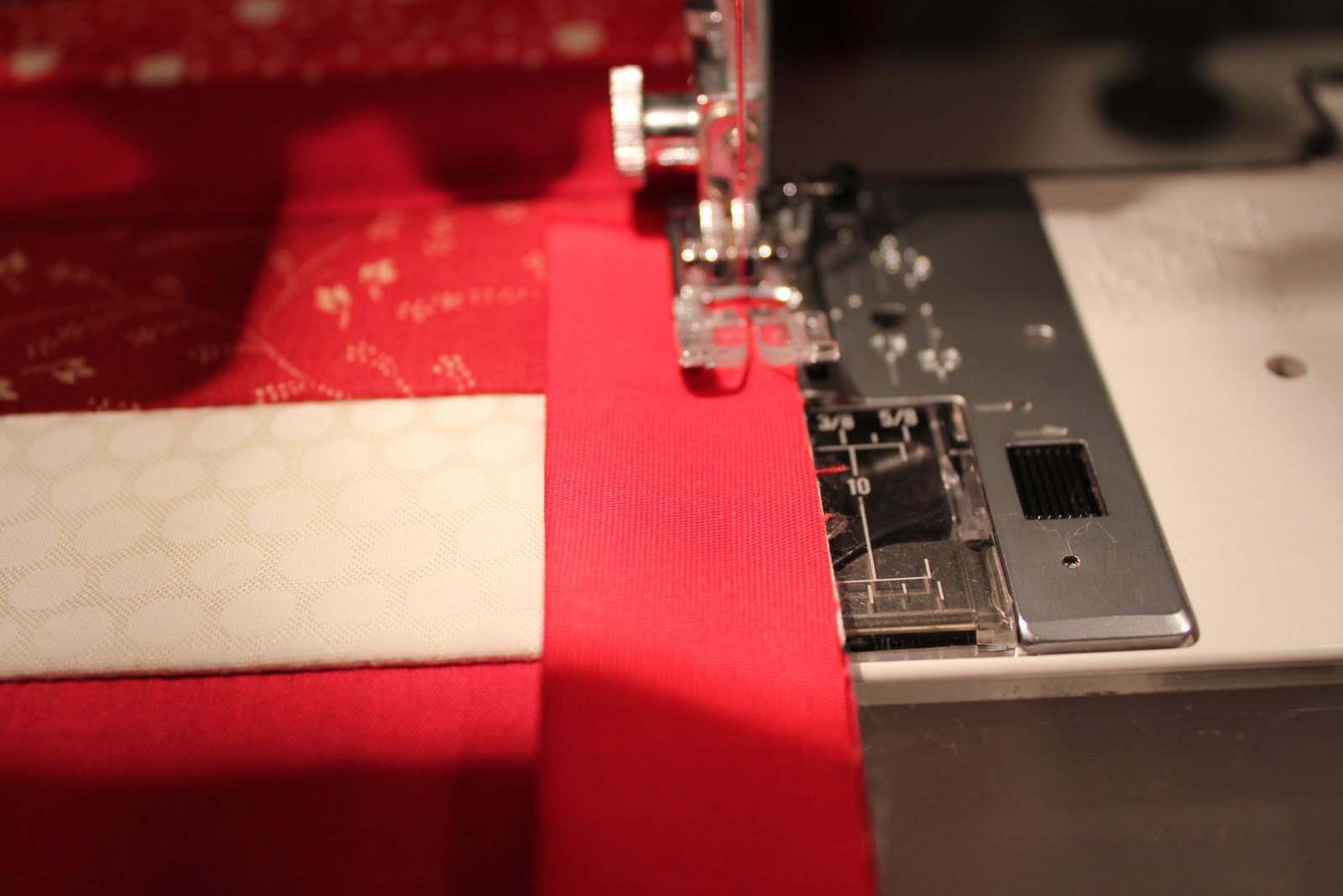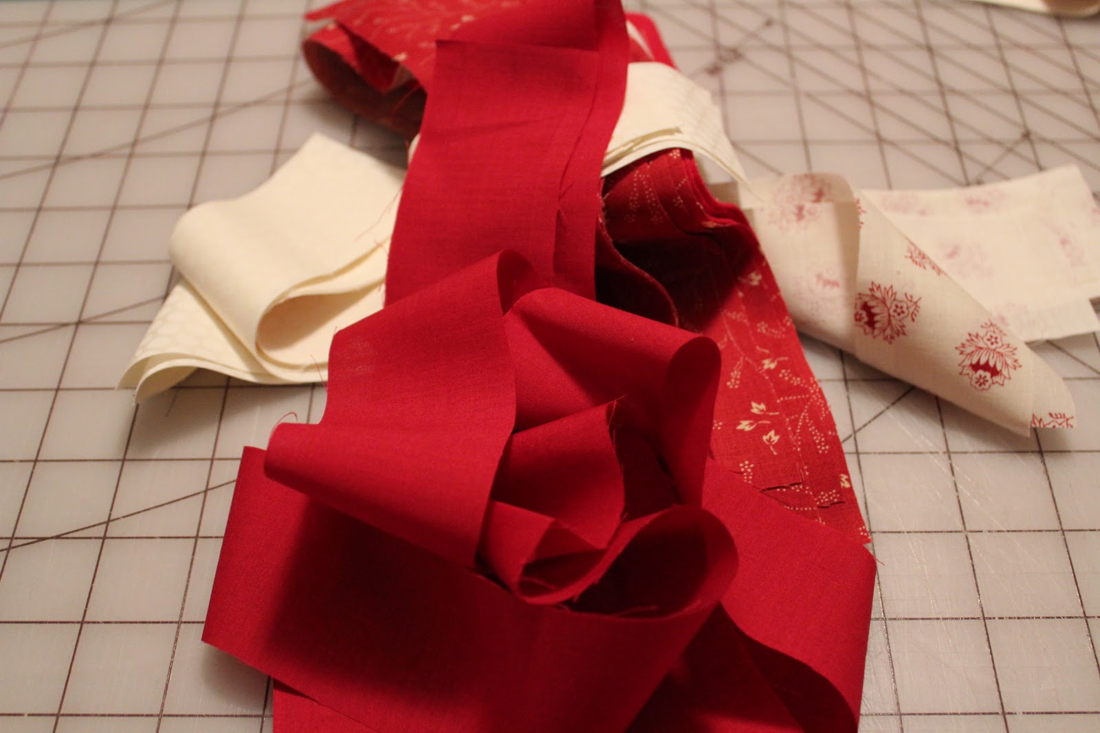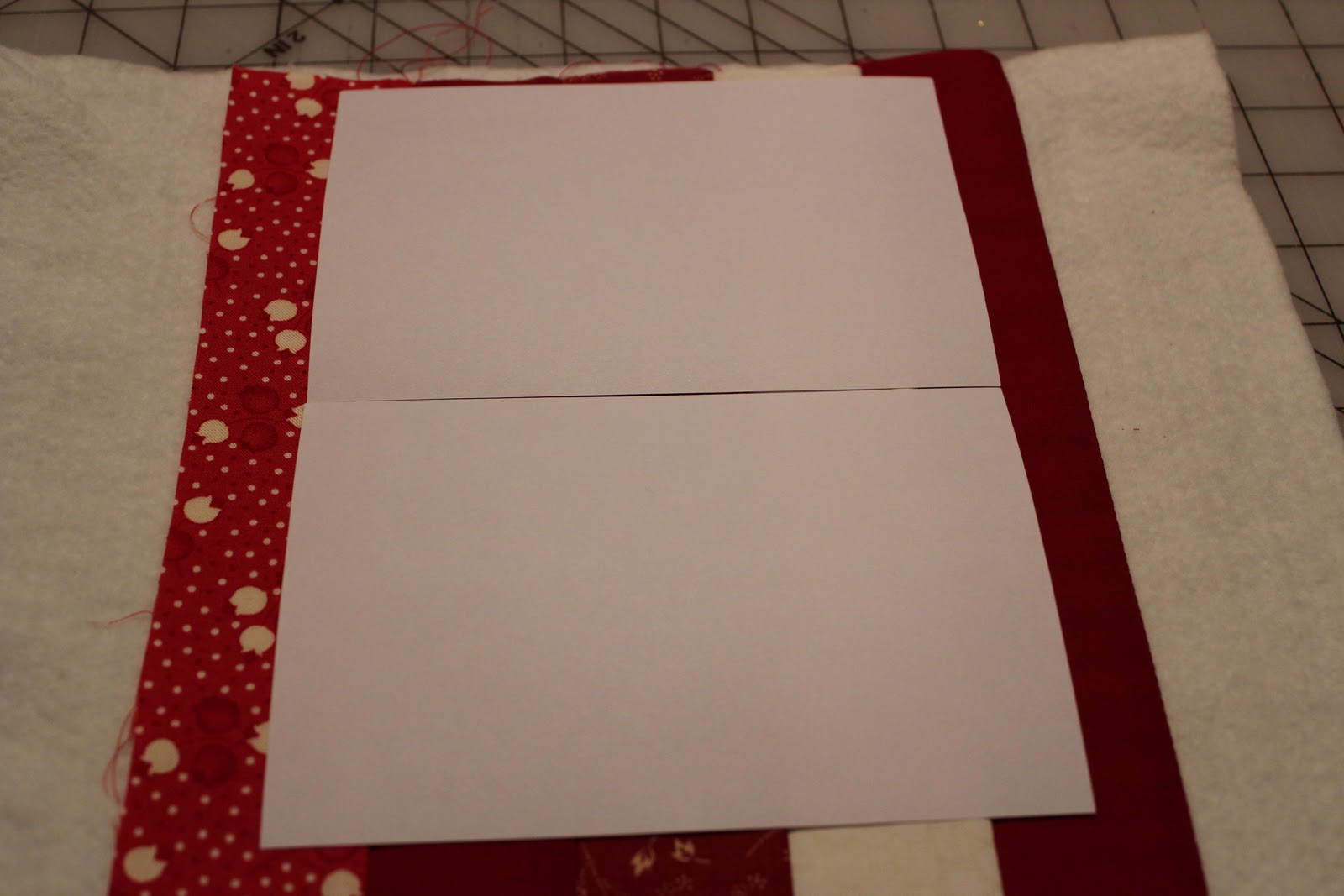 You’ll need: Fabric strips (mine were all 2″, but any size, even different sizes would work); index cards; batting scraps (at least as large as your index card), glue; and a scrap of fabric for the heart.