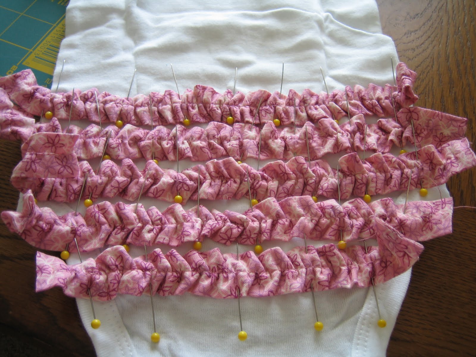 I pinned the ruffle strips down on the lines I marked, using lots of pins. I had to be careful not to pull on the ruffle strips, because doing so can “un-do” some of the ruffling.