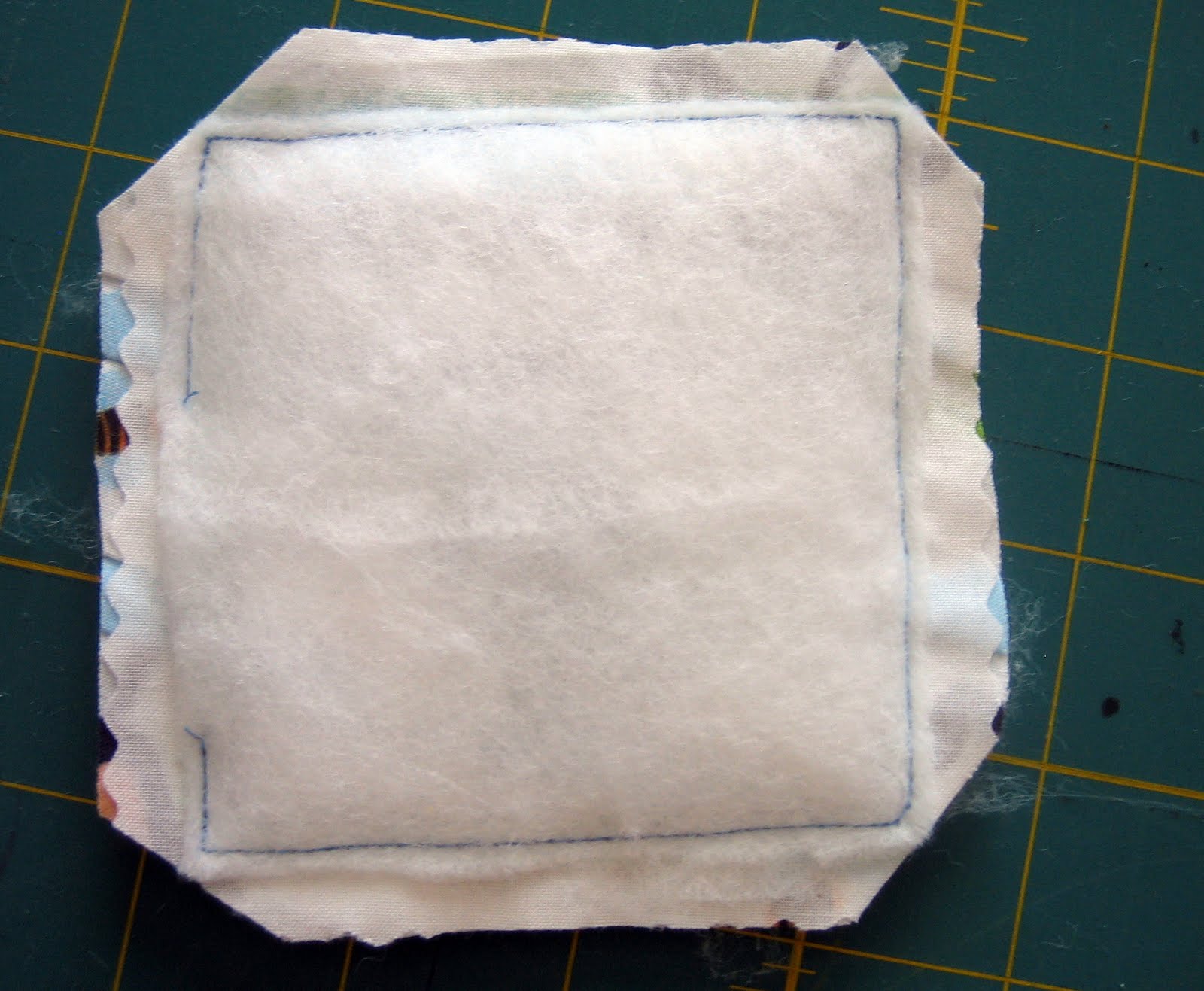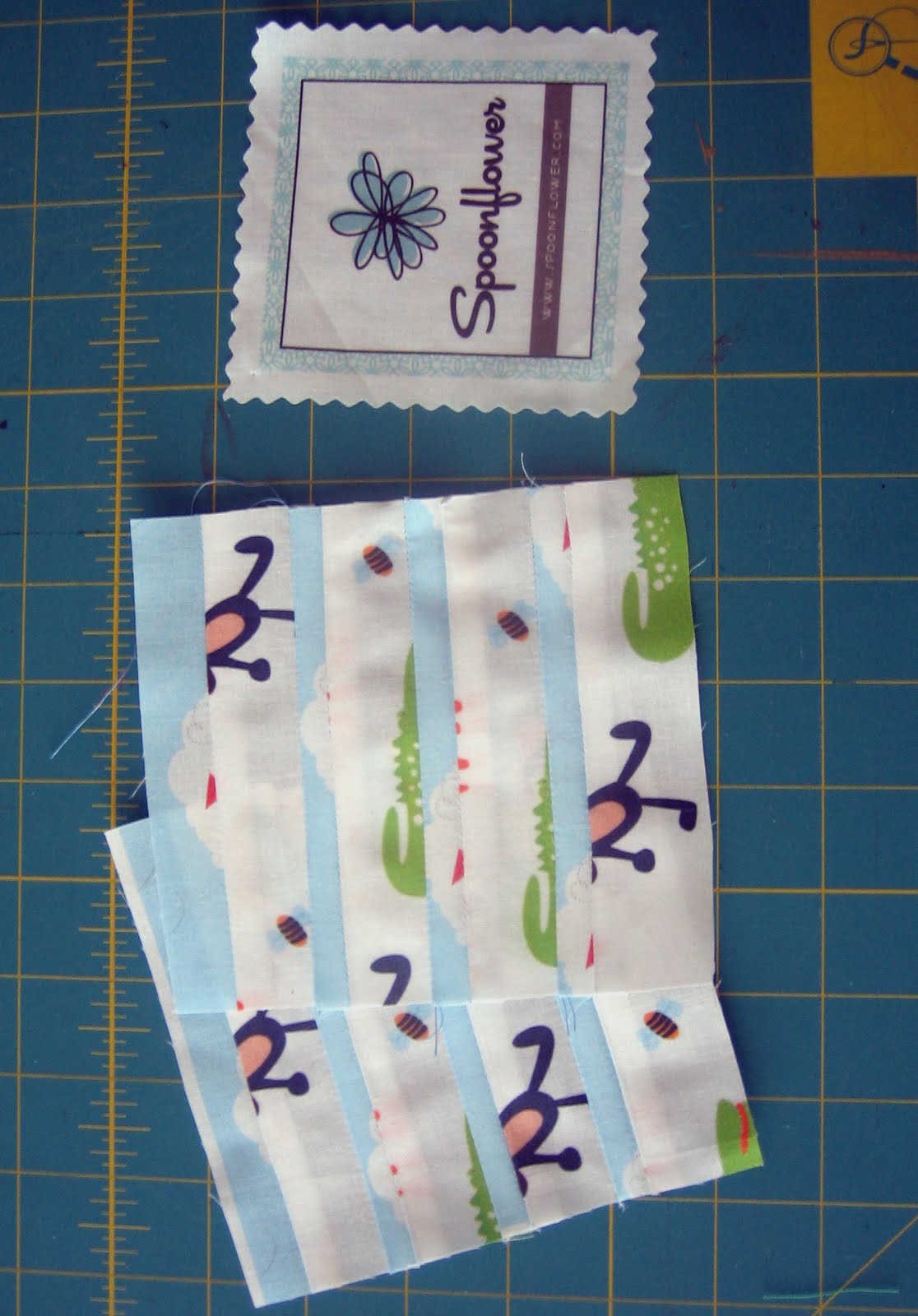 I didn’t want to throw him away, but what do you do with one little scrap? I wanted to do something, especially since I’d mailed off all of my Spoonflower fabrics, and wouldn’t have anything to show for it for weeks and weeks. I decided to turn the Spoonflower logo into a pincushion, and of course I couldn’t use non-Spoonflower fabrics, so I pieced together scraps to make the back. He’s not perfect, but here’s how I made him.